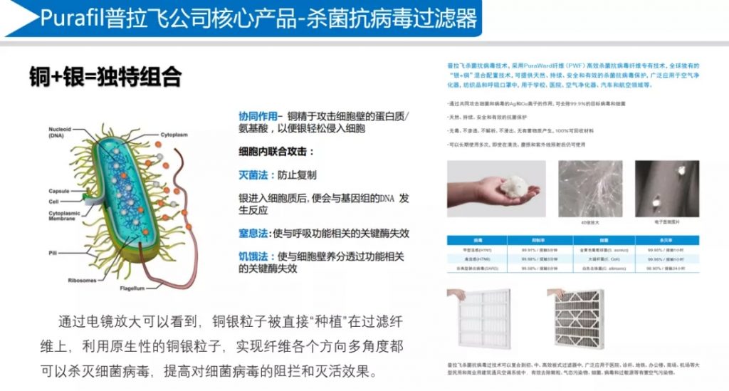 普拉飞杀菌抗病毒过滤器复合普拉飞专有PuraWard杀菌抗病毒纤维技术,提供有效的颗粒物过滤效率的同时,采用全球独有的“银+铜”离子混合配置技术,同时可以对99.9%的目标病毒和细菌进行灭活和抑制。过滤材料在美国第三方实验室严格测试,对非典型肺炎(SARS)病毒抑制率99.58%,禽流感病毒(H7N9) 抑制率 99.98%,甲型流感病毒(H1N1) 抑制率 99.91%。甲型流感病毒H1N1、传染性非典型肺炎冠状病毒SARS和新冠病毒CoVid-19都是包膜病毒。病毒粒子的外层是一层脂质膜,病毒借助其繁殖。包膜病毒依赖于脂质膜保护层,是最容易失活的病毒类型。由于新冠病毒CoVid-19是最近才被发现的,所以并没有多少科学研究提出哪一种消毒技术有效。我们认为普拉飞PuraWard纤维对包膜病毒有很好的消杀效果,对新冠病毒CoVid-19也应有很好的消杀效果。