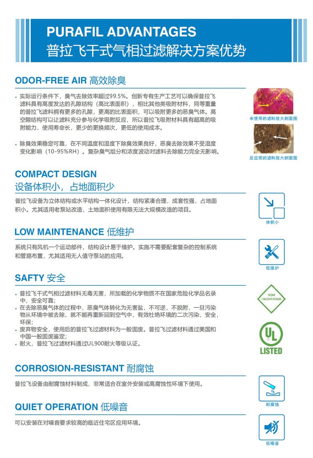 我们的专业技术和经验使我们能够设计出创新革命性产品,我们持续实验开发新材料,新工艺和新技术。我们的专利产品可有效过滤空气中颗粒物,有毒有害气体,臭味,细菌,及病毒等污染物。普拉飞化学吸附滤料能高效去除甲醛、臭氧、二氧化硫、硫化氢、氨气、TVOCs等230余种,刺激性、气味性以及腐蚀性有毒有害气态污染物。